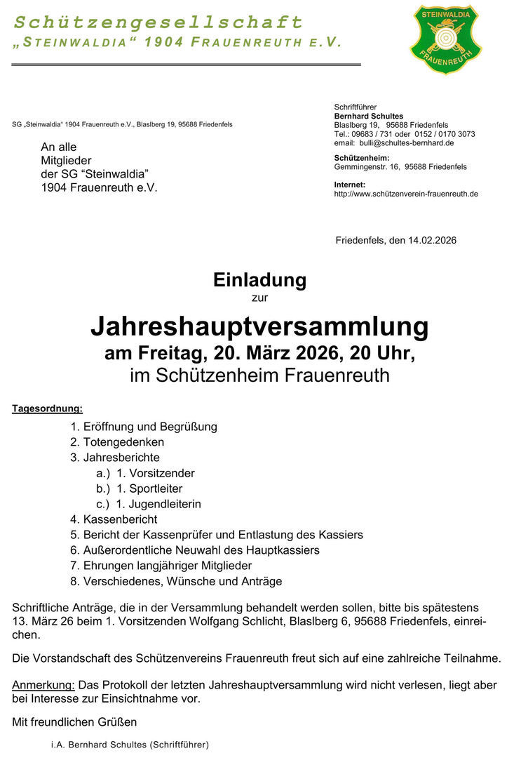 Der Jubel beim Königsschießen der Schützengesellschaft „Steinwaldia“ Frauenreuth war in diesem Jahr besonders groß. Zum einen schaffte Neumitglied Christian Schraml auf Anhieb den Sprung auf den Königsthron und somit einen Eintrag in die Vereinschronik mit dem begehrtesten Titel eines jeden Schützen. Zum andern sicherten sich gleich drei Vorjahressieger erneut die Königswürde. Sophie Paukner (Jugend), Zita Schuster-Taler (Senioren) und Carsten Schlicht, als alter und neuer Pistolenkönig, repräsentieren für ein weiteres Jahr ihren Schützenverein. Sehr zur Freude der beiden Vorsitzenden, Wolfgang Schlicht und Adrian Käß, war in diesem Jahr auch das Stockerl in der Schülerklasse sowie bei den Kindern mit dem Lichtgewehr komplett besetzt. Hier wurden Janko David zum Schülerkönig und Jan Ludwig zum Kinderkönig proklamiert. In der Damenklasse schaffte es nach 2010, Tamara Höcht erneut an die Spitze. Sie wurde Schützenliesl im stark besetzten Teilnehmerfeld. Besonders erwähnenswert: Knappe Ergebnisse und oft nur durch wenige Teiler getrennt, folgten die weiteren Platzierungen. Als 1. Ritter wurden Laura Schraml, Jakob Schraml, Maria Schraml, Armin Seidel, Elena Schraml und Bernhard Stock berufen. Als 2. Ritter fungieren im Sportjahr 2026, Karim Sperber, Raphael Klupp, Petra Bannert, Wolfgang Schlicht und Bernhard Schultes. Bei der Proklamation der neuen Würdenträger freute sich Vorsitzender Wolfgang Schlicht über die gute Teilnahme am Königsschießen. Mit 34 Teilnehmern und 44 Starts in den einzelnen Wettbewerbsklassen steigerte sich die Beteiligung auf das Niveau vor Corona. Einen Applaus beim Königsschießen 2026 bekamen auch die scheidenden Hoheiten. Erika Heider, Adrian Käß, Sophie Paukner, Carsten Schlicht und Zita Schuster-Taler, bekamen die traditionellen Knackwurstketten bzw. einen Blumenstrauß.