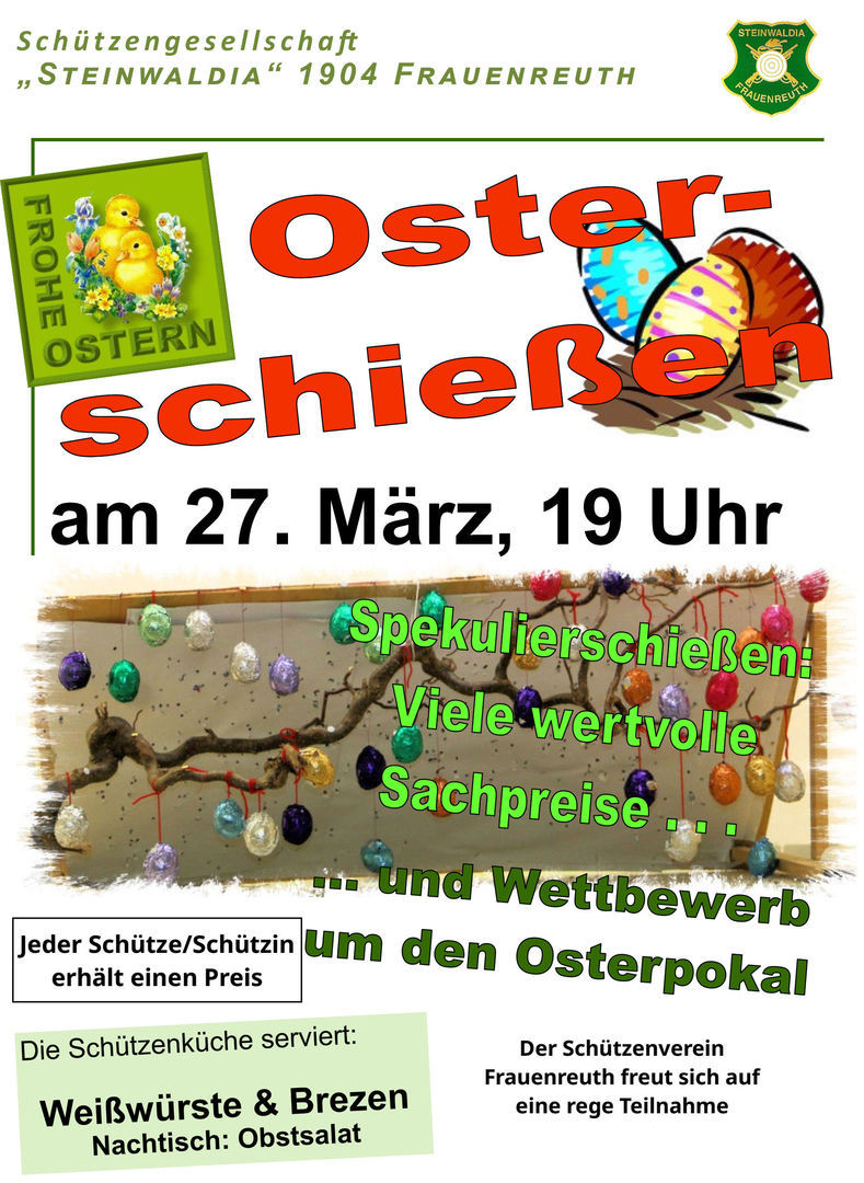 28 Schützinnen und Schützen folgten der Einladung des Schützenvereins. Im Frauenreuther Schützenheim trafen sich die Mitglieder in geselliger Runde zum diesjährigen Osterschießen. Jede/r Teilnehmer/in hatte vier Schüsse auf das Ziel. Bei drei Schüssen ging es um den Osterpokal, ein Schuss musste auf die vorbereiteten, bunten Ostereier abgegeben werden. Die an einem großen verzweigten Ast aufgehängten Eier waren wie alle Jahre mit einer Glücksnummer bestückt. Die niedrigste Nummer bedeutete den ersten Platz und wurde in diesem Jahr von Reinhard Schwarz belegt. Beim Wettbewerb „Osterpokal“ stand Alfons Hage ganz oben auf der Siegerliste. Bei den Sachpreisen folgten Petra Bannert, Bernhard Schultes, Peter Kaßeckert und Sophie Paukner auf den weiteren Plätzen. Bei der Siegerehrung bedankte sich Vorsitzender Wolfgang Schlicht bei den zahlreichen Helfern, die angefangen vom Einkauf der Preise, der Verbreitung der Ostereier, der Beaufsichtig des Osterschießens bis hin zu einem schmackhaften Essen, wieder einmal für eine reibungslose Durchführung des Osterschießens gesorgt hatten. Das Büffet, vorbereitet von zahlreichen Schützenfrauen, fand guten Anklang.