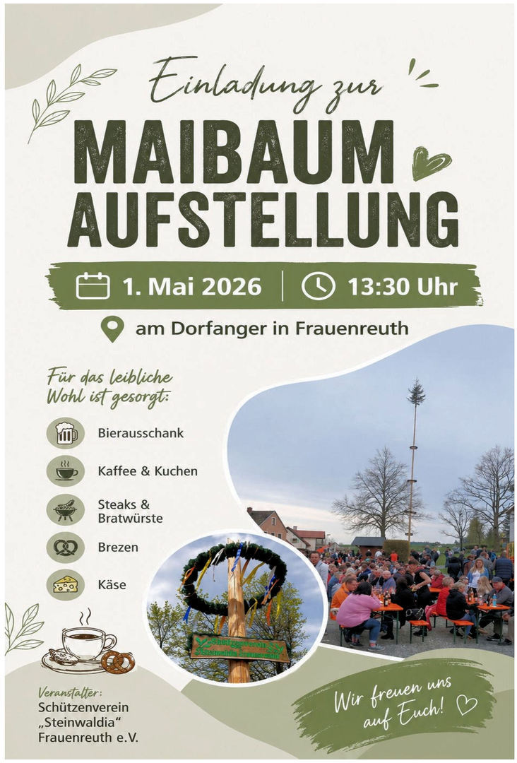 (3.5.2025) Die Frauenreuther Sportschützen danken allen Unterstützern und Helfern, die am 1. Mai mit Stangen und in Handarbeit den Maibaum am Dorfanger in Frauenreuth mit in die Höhe hievten. Das generationsübergreifende anschließende Maibaumfest bei strahlendem Sonnenschein lockte viele Besucher. Von der großen Auswahl an Kuchen machten die Gäste rege Gebrauch. Ein herzlicher Dank deshalb auch an alle Kuchenbäcker. Bilder von der Veranstaltung, hier …